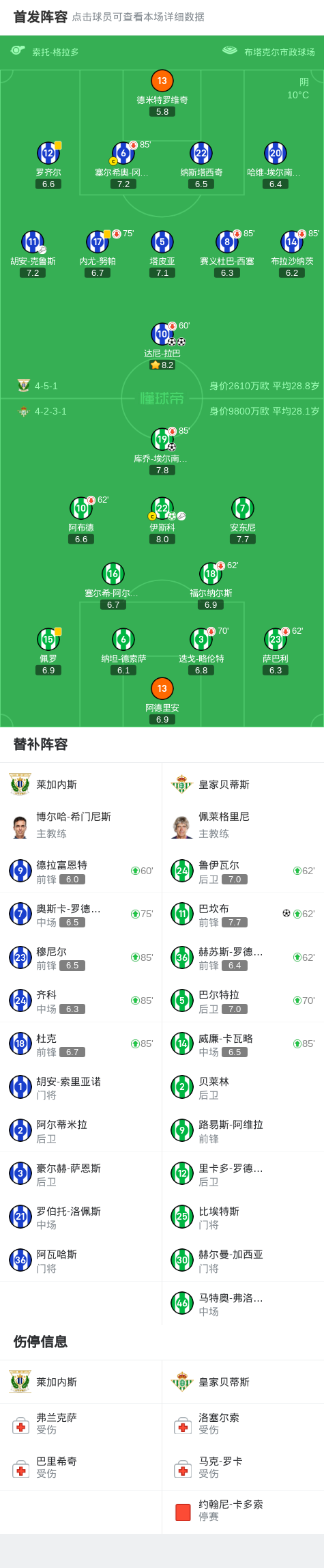 西班牙足球甲级联赛第28轮的一场焦点对决中,莱加内斯主场迎战皇家贝蒂斯。比赛一开始,莱加内斯便展现出强大的进攻能力,达尼-拉巴在第29分钟完成了一次漂亮的一条龙突破得分,为主队先下一城。在上半场补时阶段,又由胡安-克鲁斯传中送出助攻,达尼-拉巴再次破门,帮助球队取得2-0的领先优势。